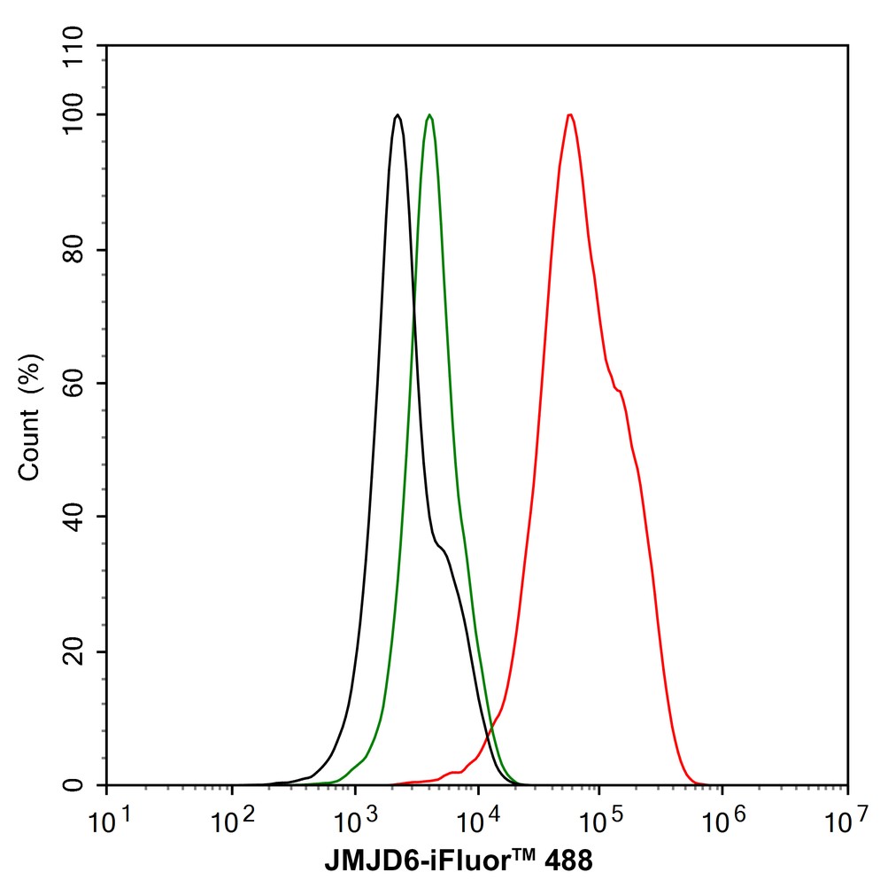 Cells were fixed in 4% paraformaldehyde for 15 minutes at room temperature, permeabilized with 0.1% Triton X-100 in PBS for 15 minutes at room temperature, then blocked with 1% BSA in 10% negative goat serum for 1 hour at room temperature. Cells were then incubated with Rabbit anti-JMJD6 antibody (HA751541) at 1/100 dilution in 1% BSA in PBST overnight at 4 ℃. Goat Anti-Rabbit IgG H&L (iFluor™ 488, HA1121) was used as the secondary antibody at 1/1,000 dilution. PBS instead of the primary antibody was used as the secondary antibody only control. Nuclear DNA was labelled in blue with DAPI.
