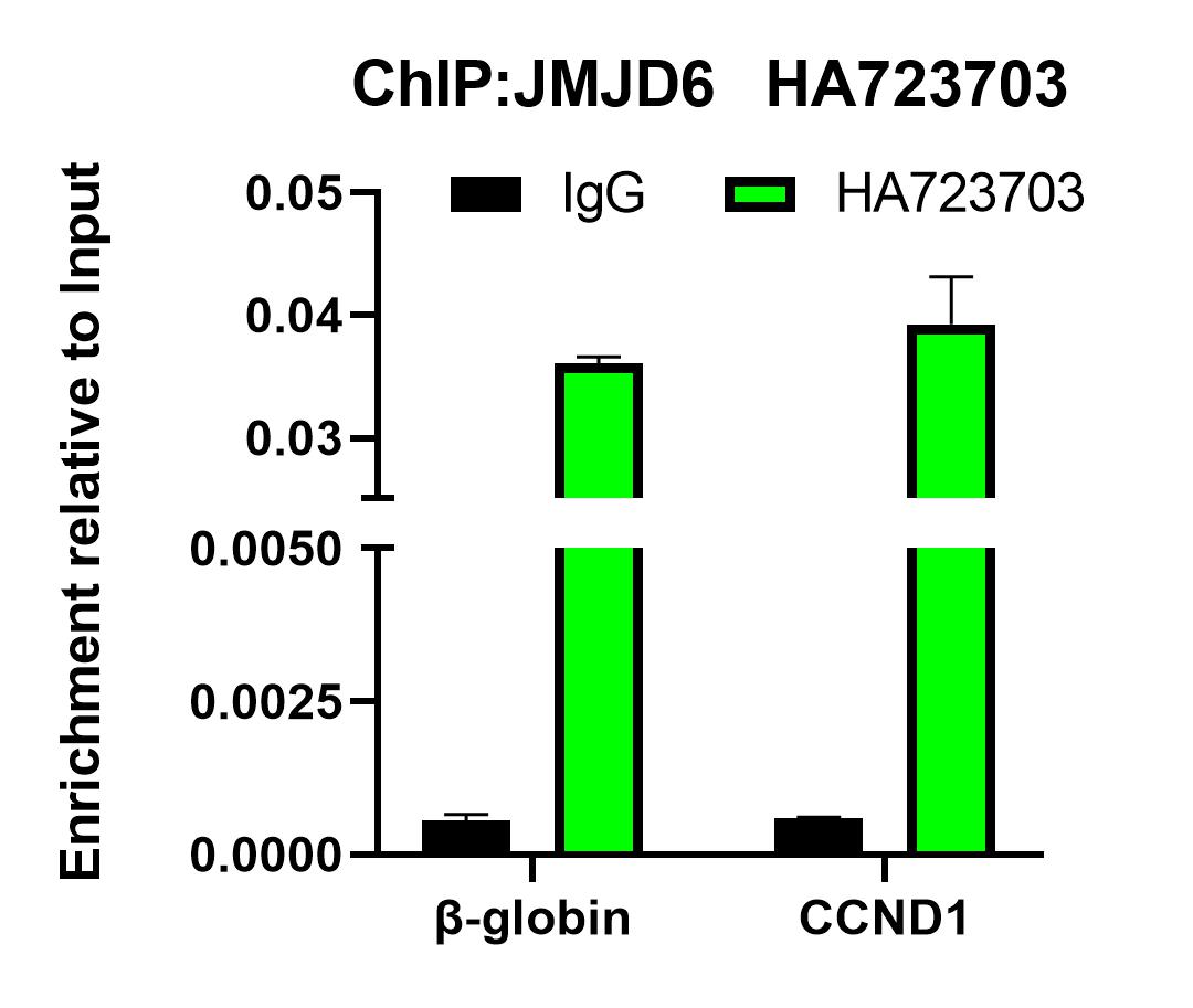 Chromatin immunoprecipitations were performed with cross-linked chromatin from HeLa cells with JMJD6 (HA751541) or Normal Rabbit IgG according to the ChIP protocol. The enriched DNA was quantified by real-time PCR using indicated primers. The amount of immunoprecipitated DNA in each sample is represented as signal relative to the total amount of input chromatin, which is equivalent to one.