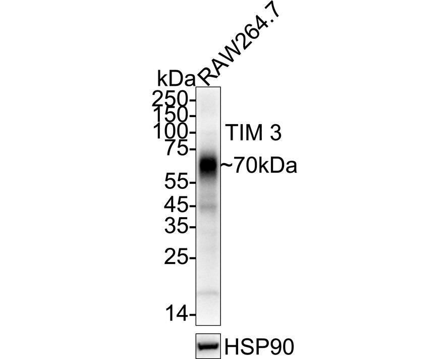 Western blot analysis of TIM 3 on RAW264.7 cell lysates with Rabbit anti-TIM 3 antibody (HA751599) at 1/2,000 dilution.