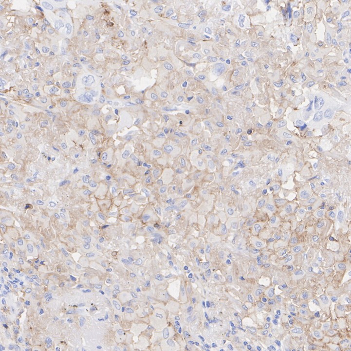 The section was pre-treated using heat mediated antigen retrieval with Tris-EDTA buffer (pH 9.0) for 20 minutes. The tissues were blocked in 1% BSA for 20 minutes at room temperature, washed with ddH2O and PBS, and then probed with the primary antibody (HA751599) at 1/200 dilution for 1 hour at room temperature. The detection was performed using an HRP conjugated compact polymer system. DAB was used as the chromogen. Tissues were counterstained with hematoxylin and mounted with DPX.