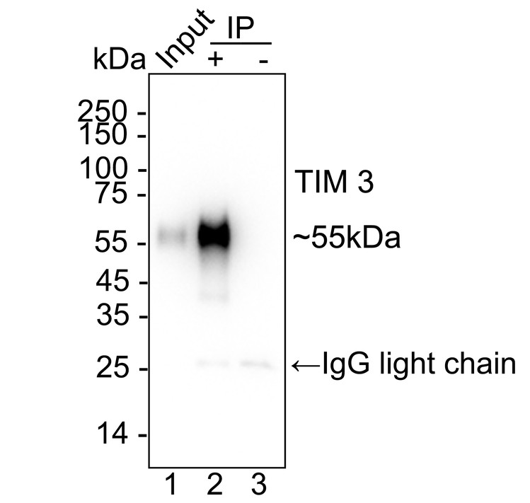 TIM 3 was immunoprecipitated from 0.2 mg RAW264.7 cell lysate with HA751599 at 2 µg/10 µl beads. Western blot was performed from the immunoprecipitate using HA751599 at 1/2,000 dilution. HRP Conjugated Anti-Rabbit IgG for IP Nano-secondary antibody at 1/5,000 dilution was used for 1 hour at room temperature.