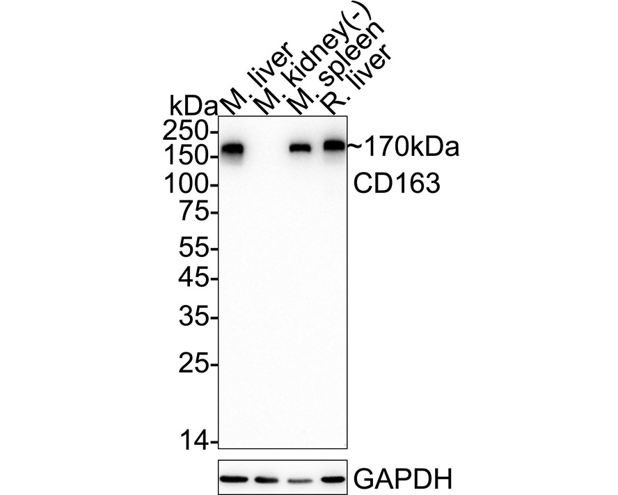 Western blot analysis of CD163 on different lysates with Rabbit anti-CD163 antibody (HA751688) at 1/5,000 dilution.