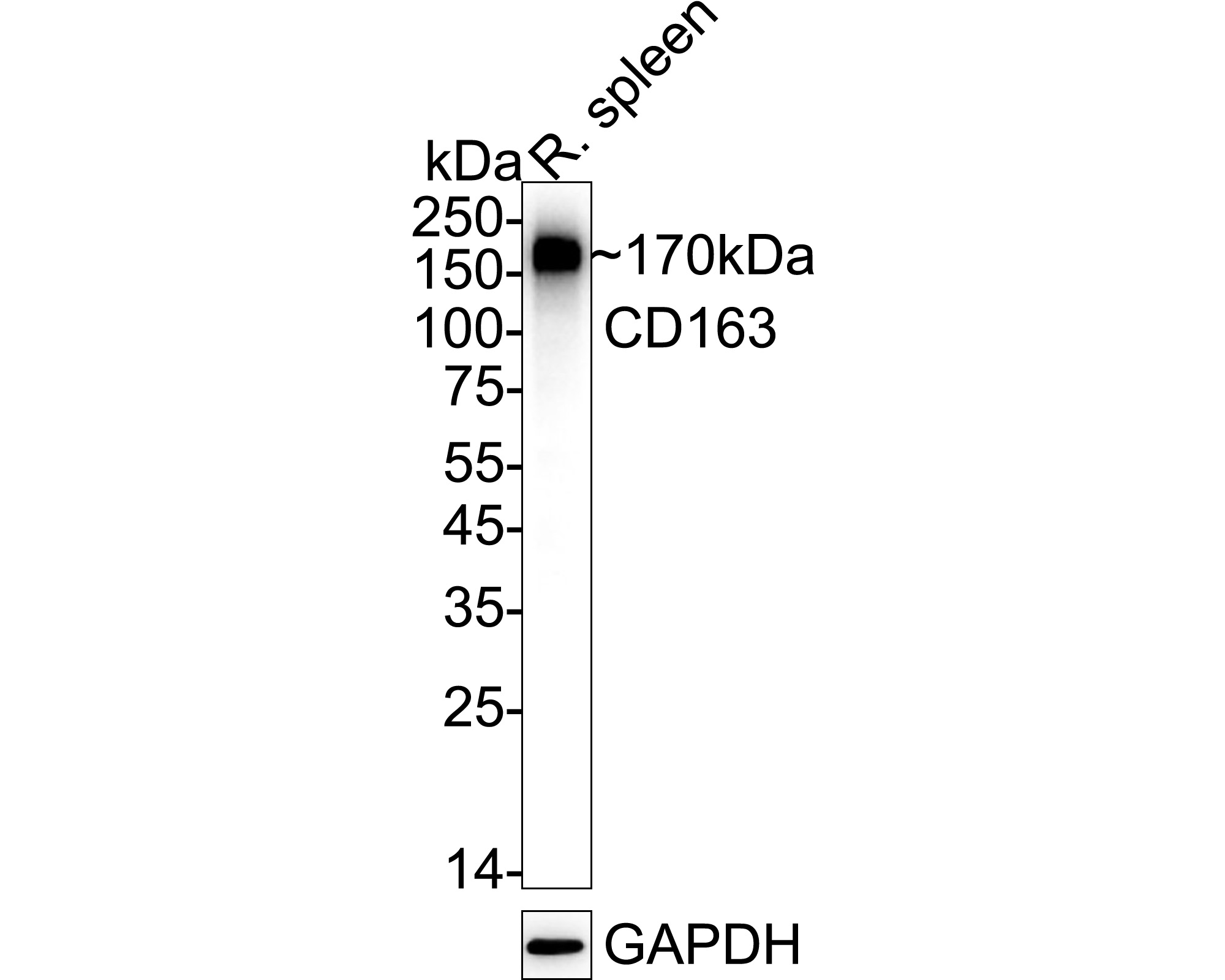 Western blot analysis of CD163 on rat spleen tissue lysates with Rabbit anti-CD163 antibody (HA751688) at 1/5,000 dilution.