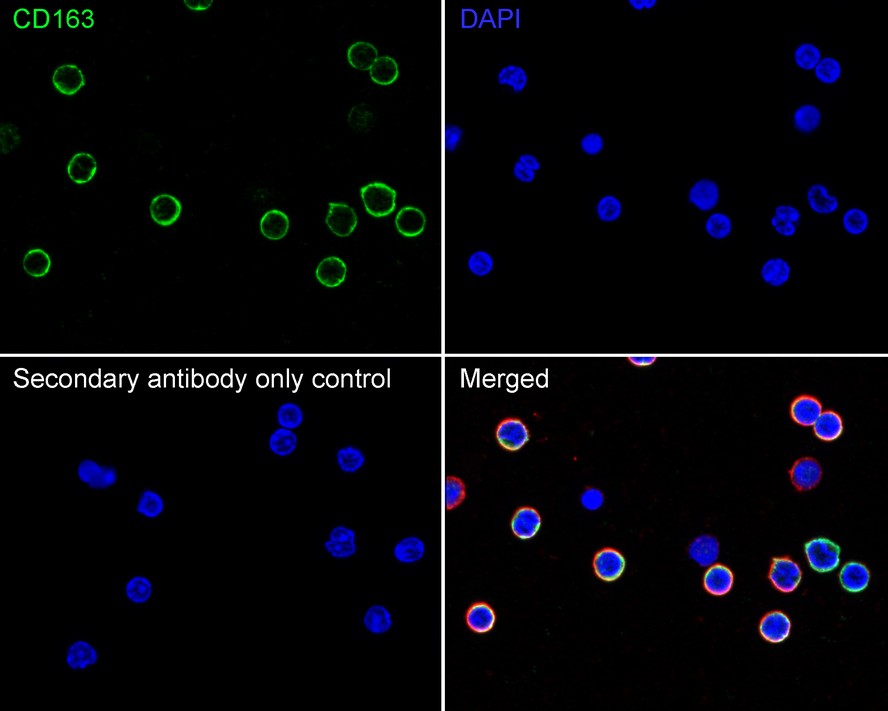 Cells were fixed in 4% paraformaldehyde for 15 minutes at room temperature, permeabilized with 0.1% Triton X-100 in PBS for 15 minutes at room temperature, then blocked with 1% BSA in 10% negative goat serum for 1 hour at room temperature. Cells were then incubated with Rabbit anti-CD163 antibody (HA751688) at 1/500 dilution in primary antibody dilution (K1803) overnight at 4 ℃. Goat Anti-Rabbit IgG H&L (iFluor™ 488, HA1121) was used as the secondary antibody at 1/1,000 dilution. PBS instead of the primary antibody was used as the secondary antibody only control. Nuclear DNA was labelled in blue with DAPI.