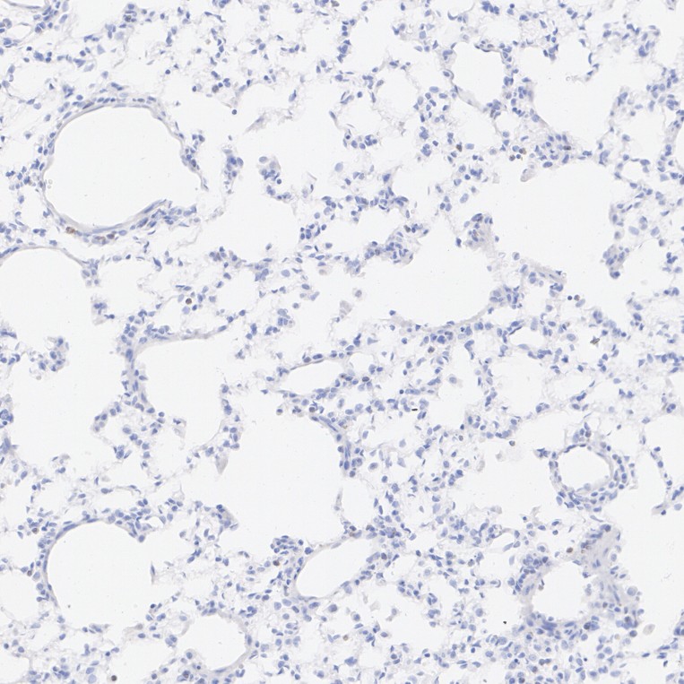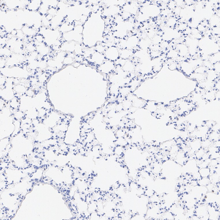 Immunohistochemical analysis of paraffin-embedded mouse lung tissue (negative) with Rabbit anti-Oct6 antibody (HA751761) at 1/1,000 dilution.