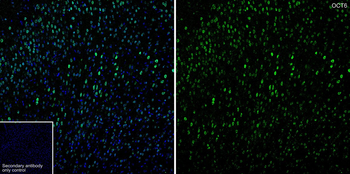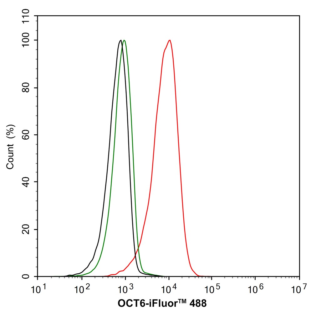 Cells were fixed in 100% precooled methanol for 5 minutes at room temperature, then blocked with 1% BSA in 10% negative goat serum for 1 hour at room temperature. Cells were then incubated with Rabbit anti-Oct6 antibody (HA751761) at 1/100 dilution in 1% BSA in PBST overnight at 4 ℃. Goat Anti-Rabbit IgG H&L (iFluor™ 488, HA1121) was used as the secondary antibody at 1/1,000 dilution. PBS instead of the primary antibody was used as the secondary antibody only control. Nuclear DNA was labelled in blue with DAPI.