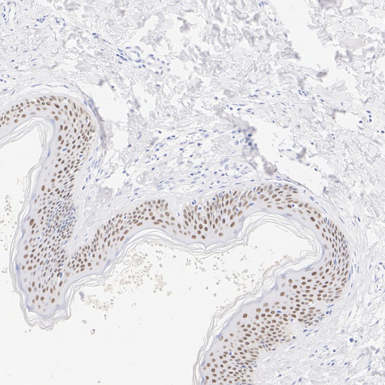 Immunohistochemical analysis of paraffin-embedded human skin tissue with Rabbit anti-Oct6 antibody (HA751761) at 1/4,000 dilution.