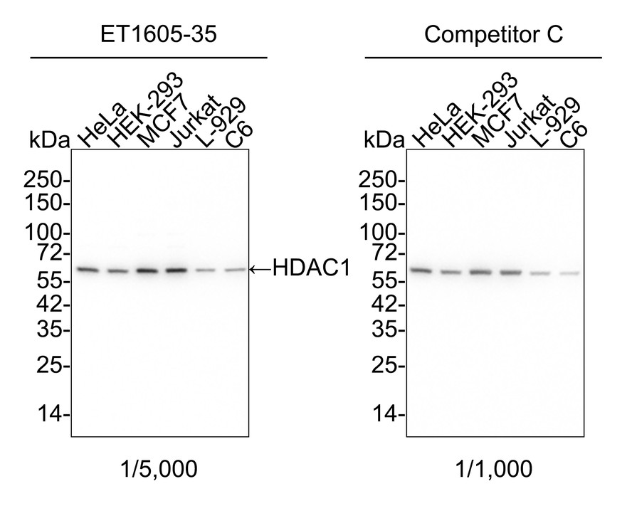 Western blot analysis of HDAC1 on different lysates with Rabbit anti-HDAC1 antibody (ET1605-35) at 1/5,000 dilution and competitor's antibody at 1/1,000 dilution.
