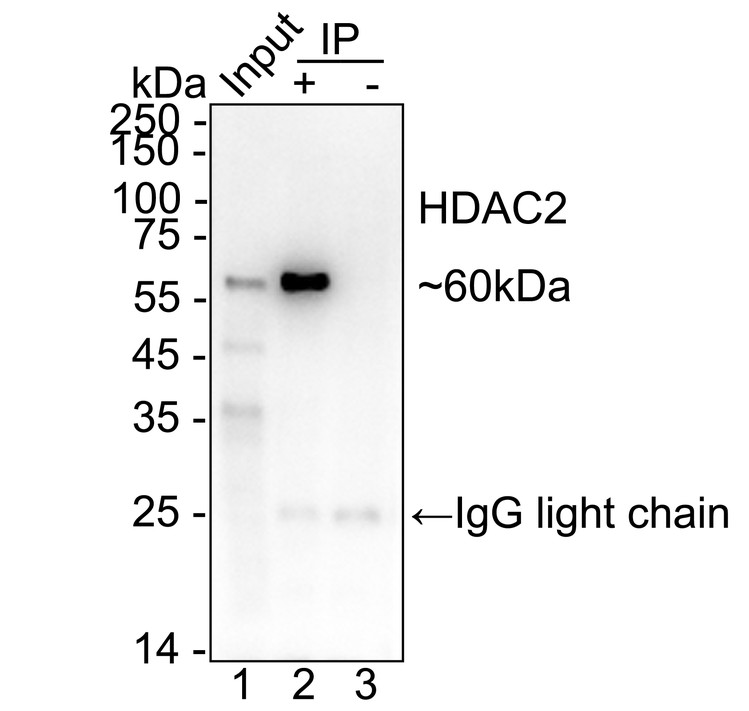 HDAC2 was immunoprecipitated from 0.2 mg NIH/3T3 cell lysate with HA750134 at 2 µg/10 µl beads. Western blot was performed from the immunoprecipitate using HA750134 at 1/1,000 dilution. HRP Conjugated Anti-Rabbit IgG for IP Nano-secondary antibody at 1/5,000 dilution was used for 1 hour at room temperature.