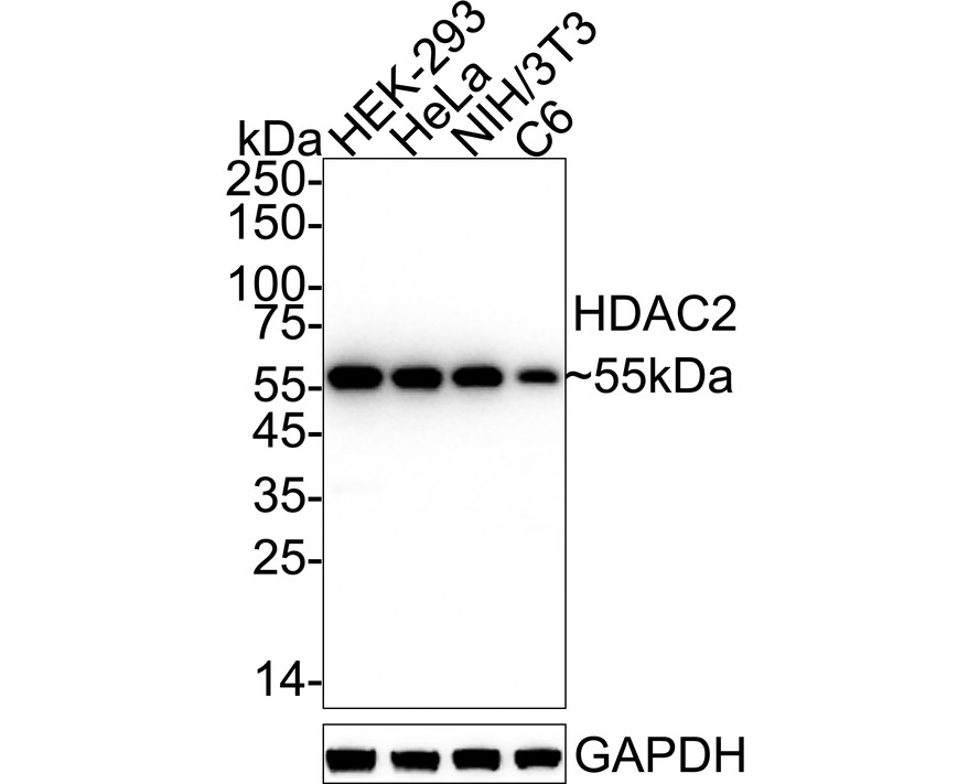 Western blot analysis of HDAC2 on different lysates with Rabbit anti-HDAC2 antibody (HA750134) at 1/20,000 dilution.