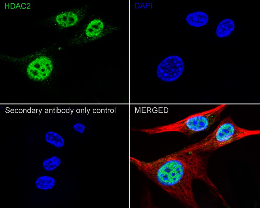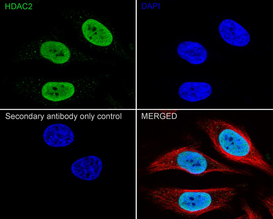 Cells were fixed in 4% paraformaldehyde for 20 minutes at room temperature, permeabilized with 0.1% Triton X-100 in PBS for 5 minutes at room temperature, then blocked with 1% BSA in 10% negative goat serum for 1 hour at room temperature. Cells were then incubated with Rabbit anti-HDAC2 antibody (HA750134) at 1/100 dilution in 1% BSA in PBST overnight at 4 ℃. Goat Anti-Rabbit IgG H&L (iFluor™ 488, HA1121) was used as the secondary antibody at 1/1,000 dilution. PBS instead of the primary antibody was used as the secondary antibody only control. Nuclear DNA was labelled in blue with DAPI.