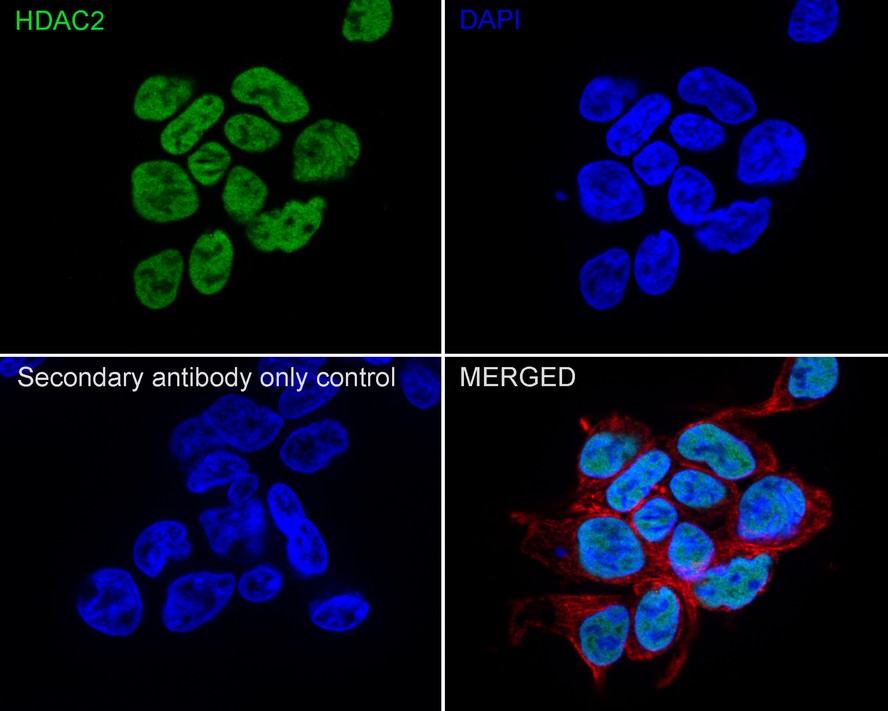 Cells were fixed in 4% paraformaldehyde for 20 minutes at room temperature, permeabilized with 0.1% Triton X-100 in PBS for 5 minutes at room temperature, then blocked with 1% BSA in 10% negative goat serum for 1 hour at room temperature. Cells were then incubated with Rabbit anti-HDAC2 antibody (HA750134) at 1/1,000 dilution in 1% BSA in PBST overnight at 4 ℃. Goat Anti-Rabbit IgG H&L (iFluor™ 488, HA1121) was used as the secondary antibody at 1/1,000 dilution. PBS instead of the primary antibody was used as the secondary antibody only control. Nuclear DNA was labelled in blue with DAPI.