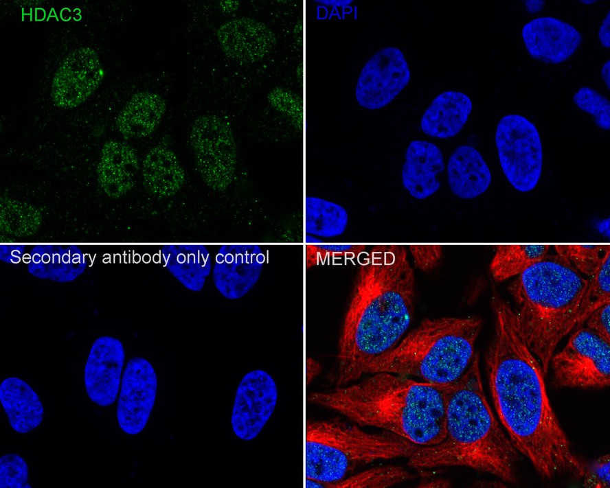 Cells were fixed in 4% paraformaldehyde for 20 minutes at room temperature, permeabilized with 0.1% Triton X-100 in PBS for 5 minutes at room temperature, then blocked with 1% BSA in 10% negative goat serum for 1 hour at room temperature. Cells were then incubated with Rabbit anti-HDAC3 antibody (HA750221) at 1/50 dilution in 1% BSA in PBST overnight at 4 ℃. Goat Anti-Rabbit IgG H&L (iFluor™ 488, HA1121) was used as the secondary antibody at 1/1,000 dilution. PBS instead of the primary antibody was used as the secondary antibody only control. Nuclear DNA was labelled in blue with DAPI.