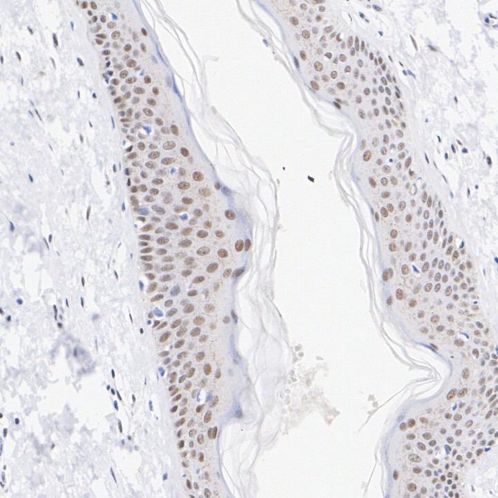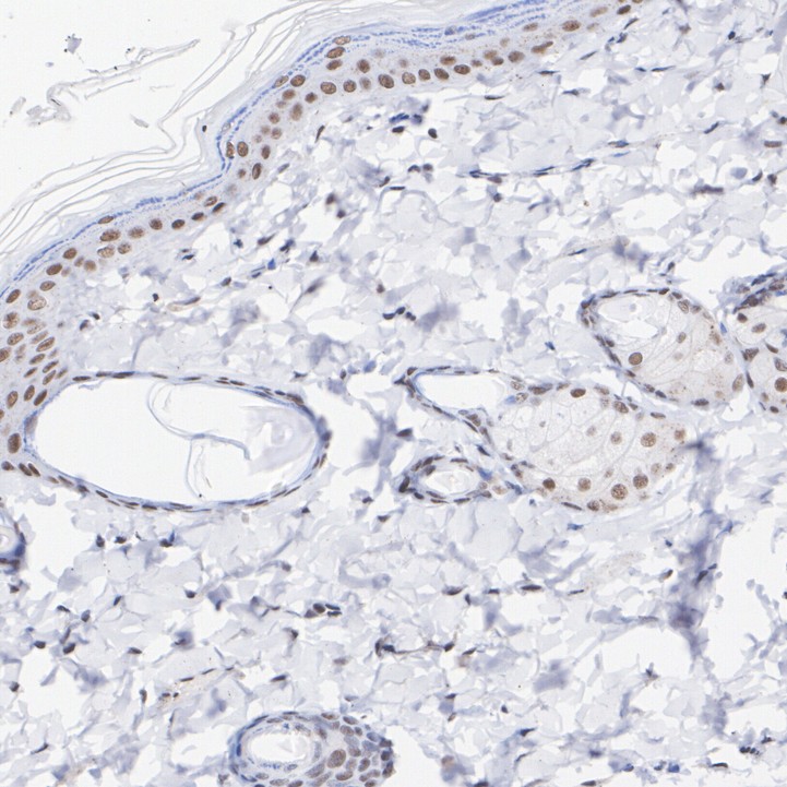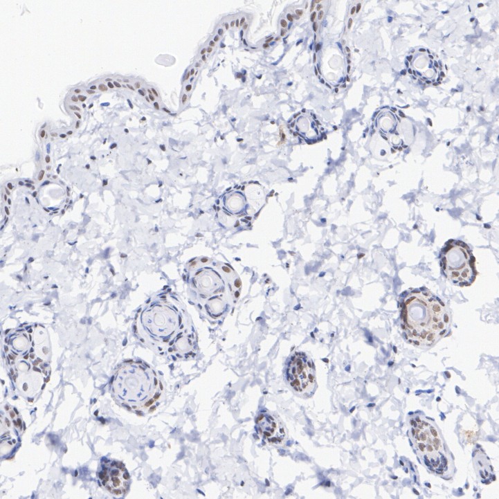 Immunohistochemical analysis of paraffin-embedded mouse skin tissue with Rabbit anti-HDAC3 antibody (HA750221) at 1/1,000 dilution.