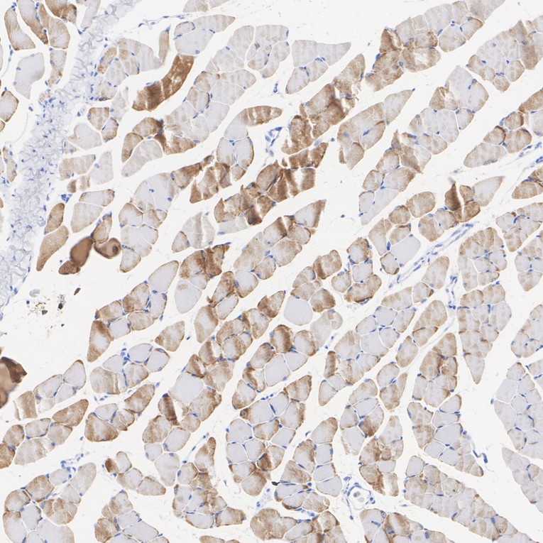 Immunohistochemical analysis of paraffin-embedded mouse skeletal muscle tissue with Rabbit anti-Hexokinase II antibody (HA723033) at 1/200 dilution.