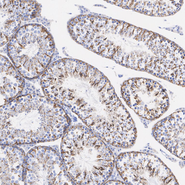 Immunohistochemical analysis of paraffin-embedded mouse testis tissue with Rabbit anti-Hexokinase II antibody (HA723033) at 1/1,000 dilution.
