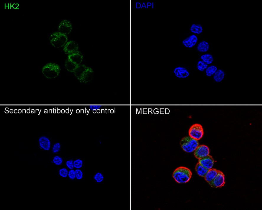 Cells were fixed in 4% paraformaldehyde for 15 minutes at room temperature, permeabilized with 0.1% Triton X-100 in PBS for 15 minutes at room temperature, then blocked with 1% BSA in 10% negative goat serum for 1 hour at room temperature. Cells were then incubated with Rabbit anti-Hexokinase II antibody (HA723033) at 1/50 dilution in 1% BSA in PBST overnight at 4 ℃. Goat Anti-Rabbit IgG H&L (iFluor™ 488, HA1121) was used as the secondary antibody at 1/1,000 dilution. PBS instead of the primary antibody was used as the secondary antibody only control. Nuclear DNA was labelled in blue with DAPI.