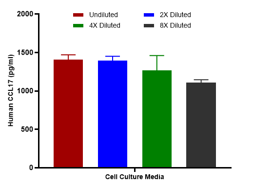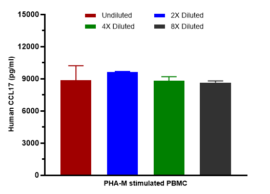 PBMC cells were stimulated with 10 µg/ml PHA-M and incubated for 5 days. The concentrations of CCL17 measured in duplicate and interpolated from the CCL17 standard curve and corrected for sample dilution. Undiluted samples are as follows: stimulated 25%. The interpolated dilution factor corrected values are plotted (mean +/- SD, n=2). The mean CCL17 concentration was determined to be 8,995 pg/ml in PHA-M stimulated PBMC cell culture supernatant.