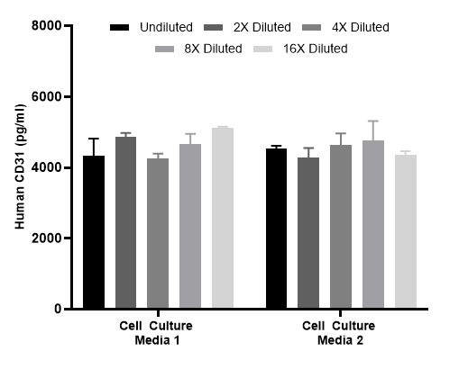 The concentrations of CD31 were measured in duplicates, interpolated from the CD31 standard curves and corrected for sample dilution. Undiluted samples are as follows: cell culture media 50%. The interpolated dilution factor corrected values are plotted (mean +/- SD, n=2).