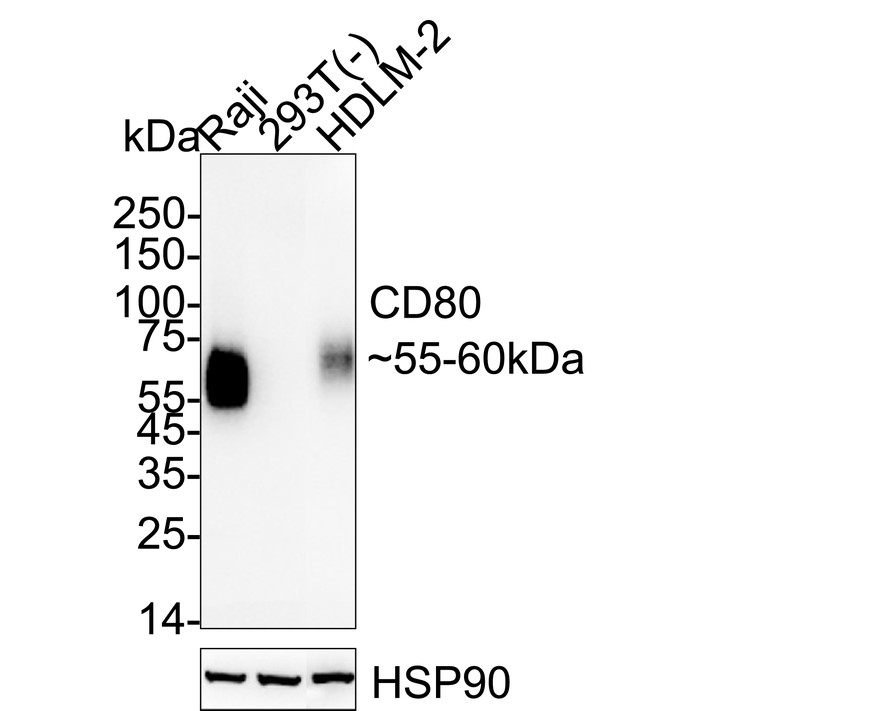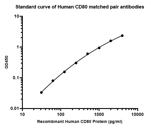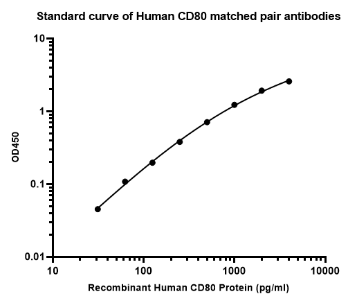 Elisa assay was performed by coating wells of a 96-well plate with 100 µl per well of capture antibody (HA723123) diluted in carbonate/bicarbonate buffer, at a concentration of 2ug/ml overnight at 4℃. Wells of the plate were washed, blocked with 150 µl 0.05% tween-20 1% BSA blocking buffer, and incubated with serial diluted Recombinant Human CD80 protein (HA210994) starting from 4000 pg/ml to 0 pg/ml and detect antibody (HA723127B, 0.2 µg/ml) for 1 hour at 30℃ with shaking. Then the plate was washed and incubated with 100 µl per well of SA-HRP for 0.5 hour at 30℃ with shaking. Detection was performed using an Ultra TMB Substrate for 10 minutes at room temperature in the dark. The reaction was stopped with sulfuric acid and absorbances were read on a spectrophotometer at 450 nm.