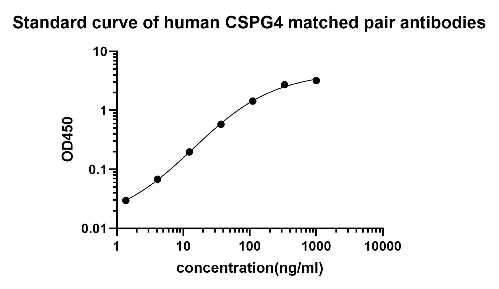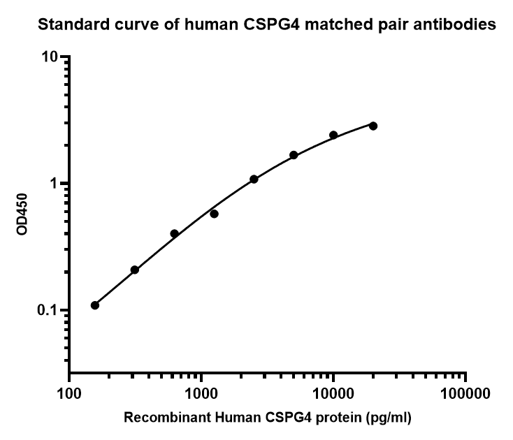 Elisa assay was performed by coating wells of a 96-well plate with 50 µl per well of capture antibody (HA723244) diluted in carbonate/bicarbonate buffer, at a concentration of 5 µg/mL overnight at 4℃. Wells of the plate were washed, blocked with 150 µl 0.05% tween-20 1% BSA blocking buffer, and incubated with serial diluted Recombinant Human CSPG4 protein (HA211047) starting from 20,000 pg/ml to 0 pg/ml and detect antibody (HA723246, Biotin, 0.2 µg/ml) for 1 hour at 30℃ with shaking. Then the plate was washed and incubated with 50 µl per well of SA-HRP for 0.5 hour at 30℃ with shaking. Detection was performed using an Ultra TMB Substrate for 10 minutes at room temperature in the dark. The reaction was stopped with sulfuric acid and absorbances were read on a spectrophotometer at 450 nm.