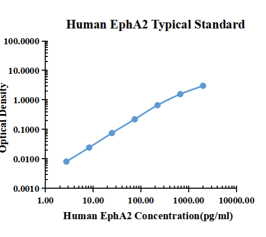 EphA2,也称为Eck、Myk2和Sek2,是Eph受体酪氨酸激酶家族的一员,该家族结合Ephrins A1、2、3、4和5。A类和B类Eph蛋白具有共同的结构结构。人类EphA2 cDNA编码976个氨基酸(aa)前体,包括24 aa信号串行、510 AA细胞外结构域(ECD)、24 aa跨膜片段和418 aa细胞质结构域。ECD包含一个N端球状结构域、一个富含半胱氨酸的结构域,以及两个纤维内联素III型结构域。胞质结构域包含一个并膜基序,含有两个酪氨酸残基,分别是主要自溶磷酸化位点、一个激酶结构域和一个无菌α基序(SAM)。人类EphA2的ECD与小鼠、牛和犬类的Aa串行同性约为90-94%,与人类EphA1、EphA1、3、4、5、7和8约45%的aa串行同性。EphA2在配体结合后被自磷酸化,随后与含SH2结构域的PI3-激酶相互作用,激活MAPK通路。反向信号也通过肾上腺素配体传播。EphA2的转录依赖于E-Cadherin的表达,且可由p53家族转录因子诱导。EphA2在乳腺癌、前列腺癌和结肠癌的血管内皮中被上调。其配体EphrinA1由局部肿瘤细胞表达。在某些情况下,EphA2和EphrinA1表达在同一血管上。EphA2信号与VEGF受体信号合作,促进内皮细胞迁移。编码人类EphA2的基因定位在1号染色体上一个在神经外胚层肿瘤中常被缺失的区域。