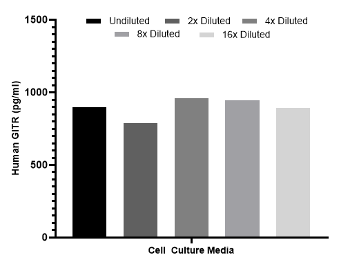 The concentrations of GITR were measured in duplicates, interpolated from the GITR standard curves and corrected for sample dilution. Undiluted samples are as follows: cell culture media 50%.