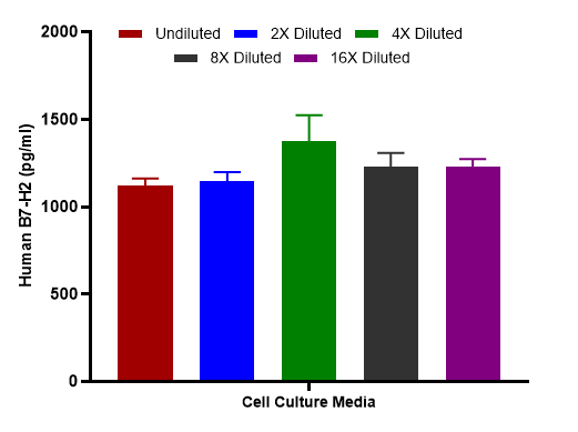 The concentrations of B7-H2 were measured in duplicates, interpolated from the B7-H2 standard curves and corrected for sample dilution. Undiluted samples are as follows: cell culture media 50%. The interpolated dilution factor corrected values are plotted (mean +/- SD, n=2).
