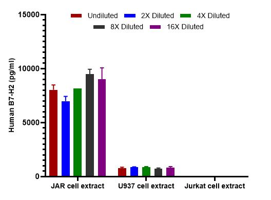 The concentrations of B7-H2 were measured in duplicates, interpolated from the B7-H2 standard curve and corrected for sample dilution. Undiluted samples are JAR extract 10%, U937 extract 100% and Jurkat extract 100%. The interpolated dilution factor corrected values are plotted (mean +/- SD, n=2). The mean B7-H2 concentration was determined to be 8,354 pg/ml in JAR extract, 817 pg/ml in U937 extract and undetectable in Jurkat extract.