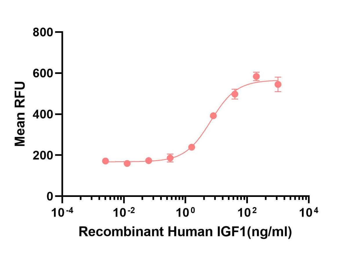 The insulin-like growth factors, isolated from plasma, are structurally and functionally related to insulin but have a much higher growth-promoting activity. May be a physiological regulator of [1-14C]-2-deoxy-D-glucose (2DG) transport and glycogen synthesis in osteoblasts. Stimulates glucose transport in bone-derived osteoblastic (PyMS) cells and is effective at much lower concentrations than insulin, not only regarding glycogen and DNA synthesis but also with regard to enhancing glucose uptake. May play a role in synapse maturation. Ca2+-dependent exocytosis of IGF1 is required for sensory perception of smell in the olfactory bulb. Acts as a ligand for IGF1R. Binds to the alpha subunit of IGF1R, leading to the activation of the intrinsic tyrosine kinase activity which autophosphorylates tyrosine residues in the beta subunit thus initiatiating a cascade of down-stream signaling events leading to activation of the PI3K-AKT/PKB and the Ras-MAPK pathways. Binds to integrins ITGAV:ITGB3 and ITGA6:ITGB4. Its binding to integrins and subsequent ternary complex formation with integrins and IGFR1 are essential for IGF1 signaling. Induces the phosphorylation and activation of IGFR1, MAPK3/ERK1, MAPK1/ERK2 and AKT1.