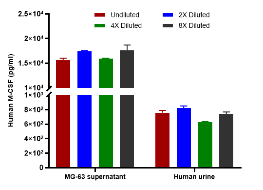 The concentrations of M-CSF were measured in duplicates, interpolated from the M-CSF standard curve and corrected for sample dilution. Undiluted samples are MG-63 cell culture supernatant 20% and human urine 50%. The interpolated dilution factor corrected values are plotted (mean +/- SD, n=2). The mean M-CSF concentration was determined to be 16,640 pg/ml in MG-63 cell culture supernatant and 738 pg/ml in human urine samples.