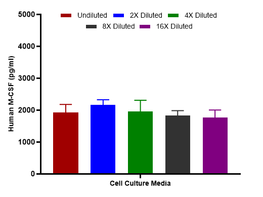 The concentrations of M-CSF were measured in duplicates, interpolated from the M-CSF standard curves and corrected for sample dilution. Undiluted samples are as follows: cell culture media 50%. The interpolated dilution factor corrected values are plotted (mean +/- SD, n=2).
