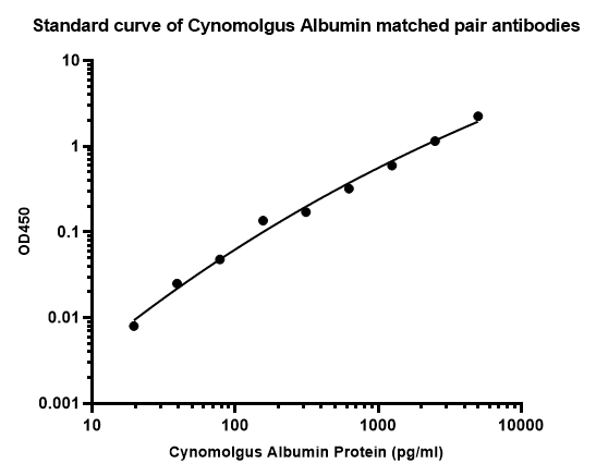 Elisa assay was performed by coating wells of a 96-well plate with 100 µl per well of capture antibody (HA724127) diluted in carbonate/bicarbonate buffer, at a concentCynomolgusion of 2 µg/mL overnight at 4℃. Wells of the plate were washed, blocked with 150 µl 0.05% tween-20 1% BSA blocking buffer, and incubated with serial diluted Monkey Albumin protein (BSA-CM101, Kactusbio) starting from 5,000 pg/ml to 0 pg/ml and detect antibody (HA724128, Biotin, 0.05 µg/ml) for 1 hour at 30℃ with shaking. Then the plate was washed and incubated with 100 µl per well of SA-HRP for 0.5 hour at 30℃ with shaking. Detection was performed using an Ultra TMB SubstHumane for 10 minutes at room temperature in the dark. The reaction was stopped with sulfuric acid and absorbances were read on a spectrophotometer at 450 nm.