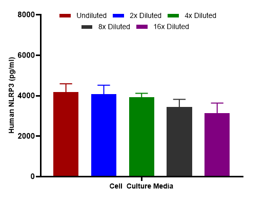 The concentrations of NLRP3 were measured in duplicates, interpolated from the NLRP3 standard curves and corrected for sample dilution. Undiluted samples are as follows: cell culture media 50%. The interpolated dilution factor corrected values are plotted (mean +/- SD, n=2).