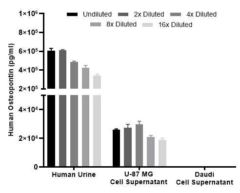 Interpolated concentration of native Osteopontin was measured in duplicate at different sample concentrations. The interpolated dilution factor corrected values were plotted (mean +/- SD, n=2). The mean Osteopontin concentration was determined to be 493 ng/mL in human urine, 25 ng/ml in U-87 MG cell culture supernatant. There was no detectable signal in Daudi cell supernatant.