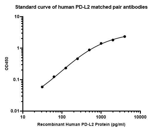 Elisa assay was performed by coating wells of a 96-well plate with 100 µl per well of capture antibody (HA723146) diluted in carbonate/bicarbonate buffer, at a concentration of 2ug/ml overnight at 4℃. Wells of the plate were washed, blocked with 150 µl 0.05% tween-20 1% BSA blocking buffer, and incubated with serial diluted Recombinant Human Human PD-L2 (HA210599) starting from 4000 pg/ml to 0 pg/ml and detect antibody (HA723148B, 0.2 µg/ml) for 1 hour at 30℃ with shaking. Then the plate was washed and incubated with 100 µl per well of SA-HRP for 0.5 hour at 30℃ with shaking. Detection was performed using an Ultra TMB Substrate for 10 minutes at room temperature in the dark. The reaction was stopped with sulfuric acid and absorbances were read on a spectrophotometer at 450 nm.