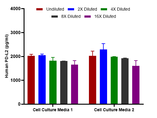 The concentrations of PD-L2 were measured in duplicates, interpolated from the PD-L2 standard curves and corrected for sample dilution. Undiluted samples are as follows: cell culture media 50%. The interpolated dilution factor corrected values are plotted (mean +/- SD, n=2).