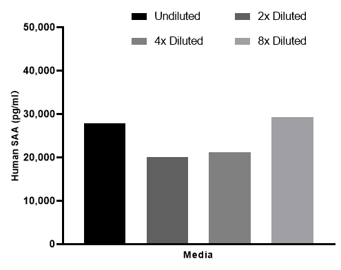 The concentrations of SAA were measured in duplicates, interpolated from the SAA standard curves and corrected for sample dilution. Undiluted samples are as follows: cell culture media 25%.