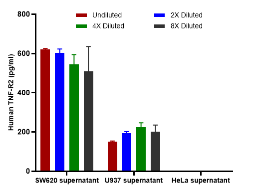 The concentrations of TNF-R2 were measured in duplicates, interpolated from the TNF-R2 standard curve and corrected for sample dilution. Undiluted samples are U937 cell culture supernatant 100%, SW620 cell culture supernatant 100% and HeLa cell culture supernatant. The interpolated dilution factor corrected values are plotted (mean +/- SD, n=2). The mean TNF-R2 concentration was determined to be 192.5 pg/ml in U937 cell culture supernatant, 569.2 pg/ml in SW620 cell culture supernatant and undetectable in HeLa cell culture supernatant.