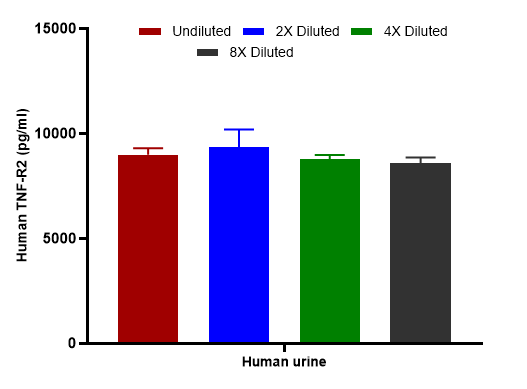 The concentrations of TNF-R2 were measured in duplicates, interpolated from the TNF-R2 standard curve and corrected for sample dilution. Undiluted samples are human urine 20%. The interpolated dilution factor corrected values are plotted (mean +/- SD, n=2). The mean TNF-R2 concentration was determined to be 8,928 pg/ml in human urine.