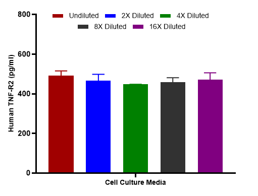 The concentrations of TNF-R2 were measured in duplicates, interpolated from the TNF-R2 standard curves and corrected for sample dilution. Undiluted samples are as follows: cell culture media 25%. The interpolated dilution factor corrected values are plotted (mean +/- SD, n=2).