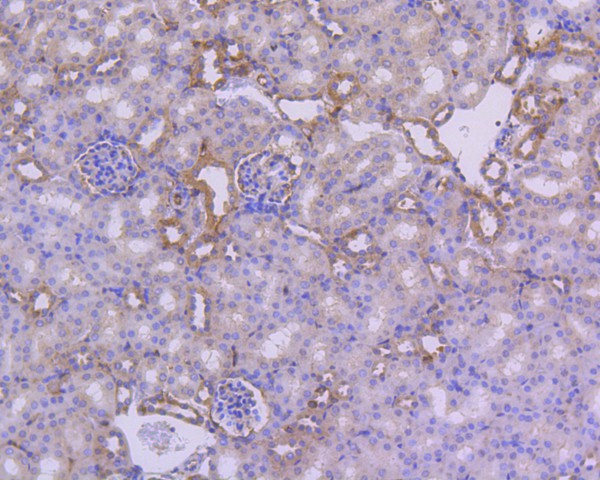 Immunohistochemical analysis of paraffin-embedded mouse kidney tissue with Rabbit anti-IKB alpha antibody (HA750068) at 1/200 dilution.