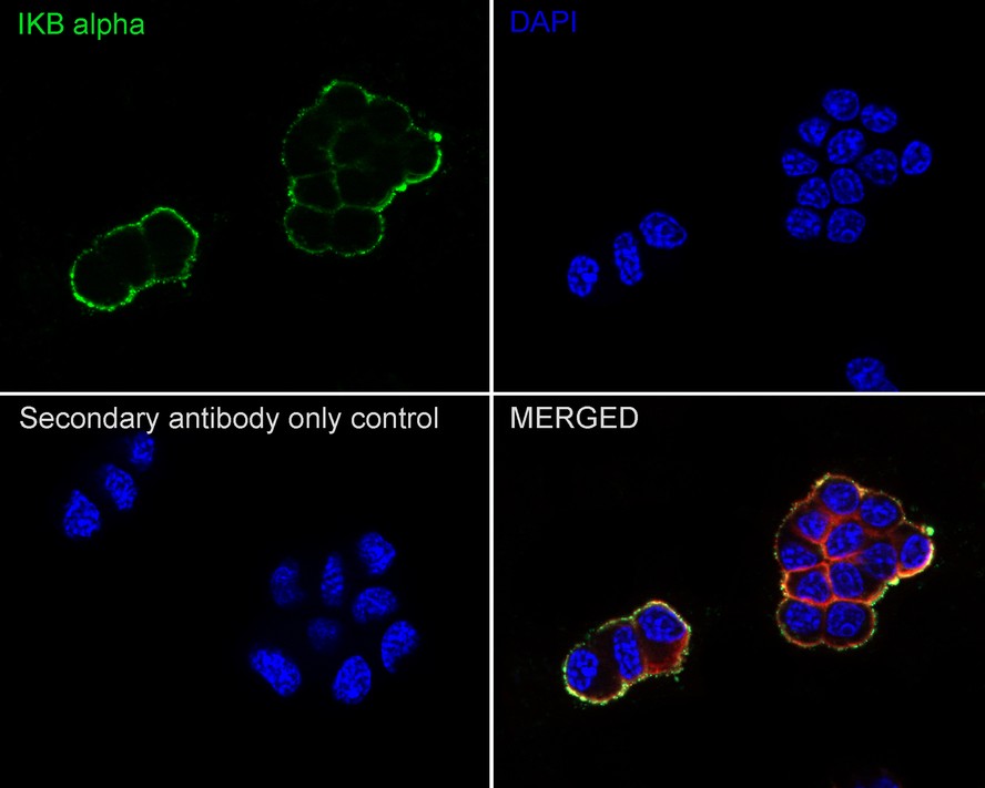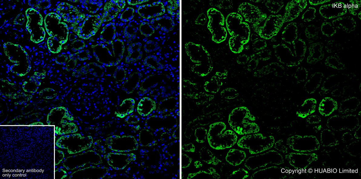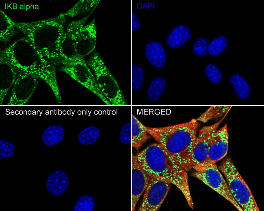 Cells were fixed in 4% paraformaldehyde for 20 minutes at room temperature, permeabilized with 0.1% Triton X-100 in PBS for 5 minutes at room temperature, then blocked with 1% BSA in 10% negative goat serum for 1 hour at room temperature. Cells were then incubated with Rabbit anti-IKB alpha antibody (HA750068) at 1/100 dilution in 1% BSA in PBST overnight at 4 ℃. Goat Anti-Rabbit IgG H&L (iFluor™ 488, HA1121) was used as the secondary antibody at 1/1,000 dilution. PBS instead of the primary antibody was used as the secondary antibody only control. Nuclear DNA was labelled in blue with DAPI.