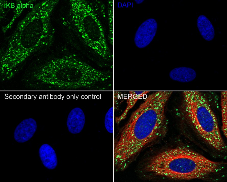 Immunocytochemistry analysis of HeLa cells labeling IKB alpha with Rabbit anti-IKB alpha antibody (HA750068) at 1/100 dilution.