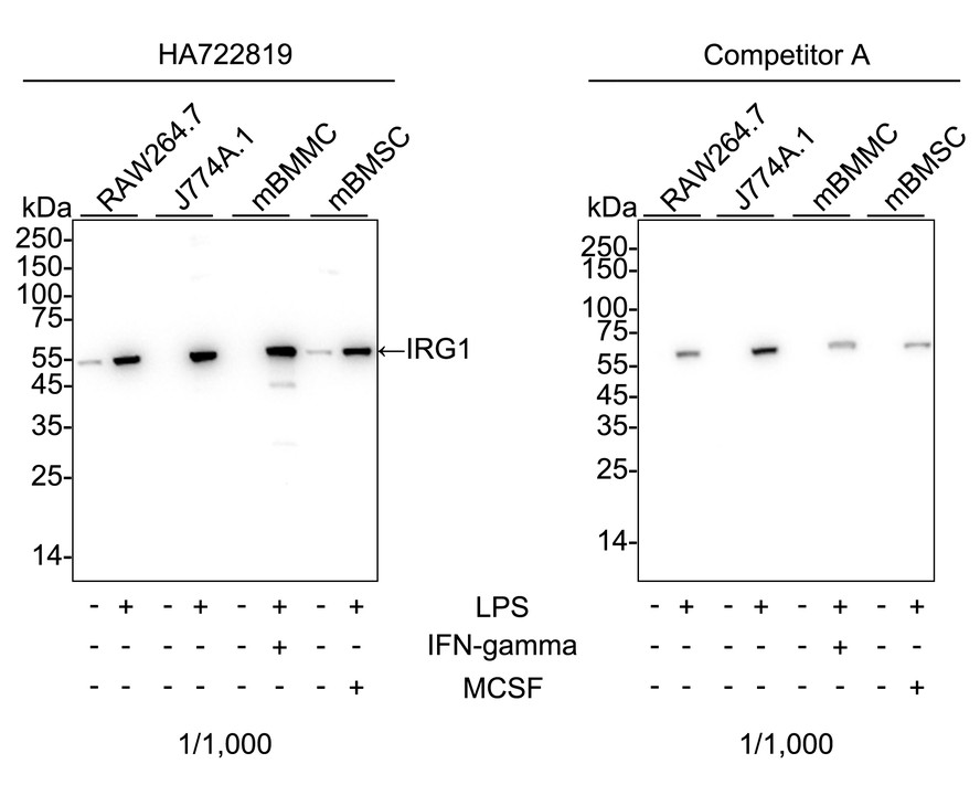 Western blot analysis of IRG1 on different lysates with Rabbit anti-IRG1 antibody (HA722819) at 1/1,000 dilution and competitor's antibody at 1/1,000 dilution.