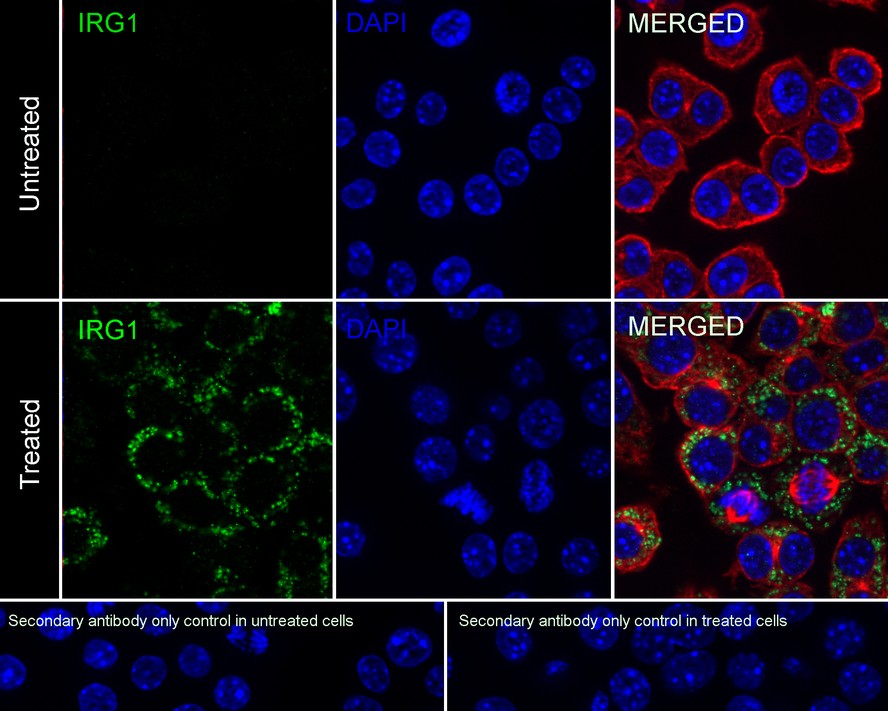 Cells were fixed in 4% paraformaldehyde for 20 minutes at room temperature, permeabilized with 0.1% Triton X-100 in PBS for 5 minutes at room temperature, then blocked with 1% BSA in 10% negative goat serum for 1 hour at room temperature. Cells were then incubated with Rabbit anti-IRG1 antibody (HA722819) at 1/100 dilution in 1% BSA in PBST overnight at 4 ℃. Goat Anti-Rabbit IgG H&L (iFluor™ 488, HA1121) was used as the secondary antibody at 1/1,000 dilution. PBS instead of the primary antibody was used as the secondary antibody only control. Nuclear DNA was labelled in blue with DAPI.