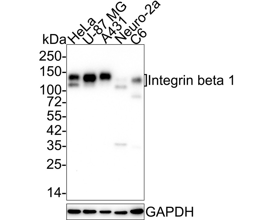 Western blot analysis of Integrin beta 1 on different lysates with Rabbit anti-Integrin beta 1 antibody (ER31001) at 1/1,000 dilution.
