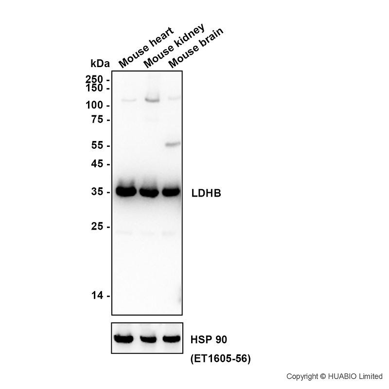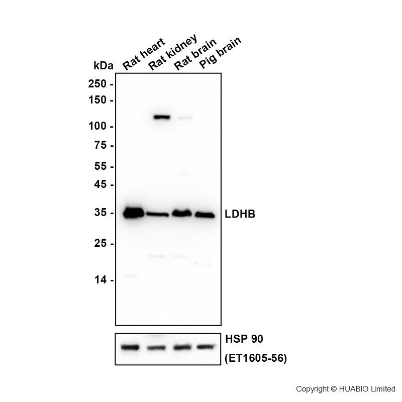 Western blot analysis of LDHB on different lysates with Rabbit anti-LDHB antibody (HA724336) at 1/50,000 dilution.