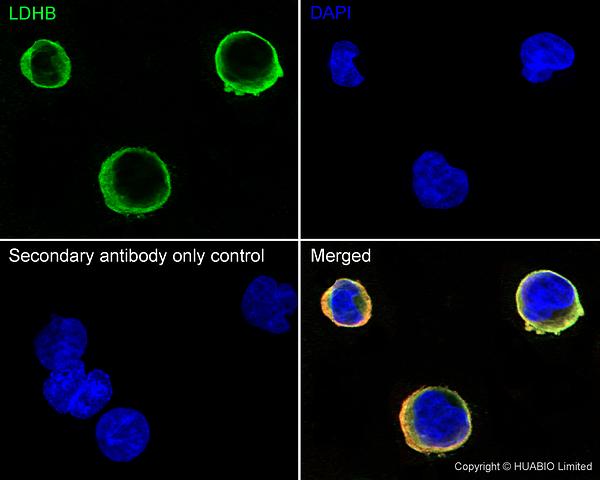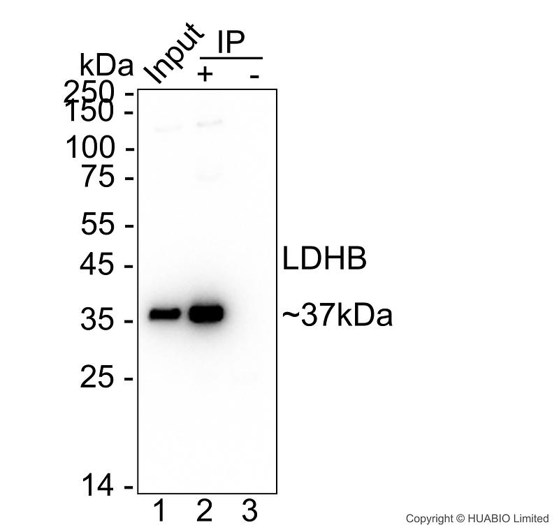 LDHB was immunoprecipitated in 0.2 mg HeLa (Human cervix adenocarcinoma epithelial cell) cell lysate with HA724336 at 2 µg/10 µl beads. Western blot was performed from the immunoprecipitate using HA724336 at 1/5,000 dilution. Anti-Rabbit IgG for IP Nano-secondary antibody (NBI01H) at 1/5,000 dilution was used for 1 hour at room temperature.