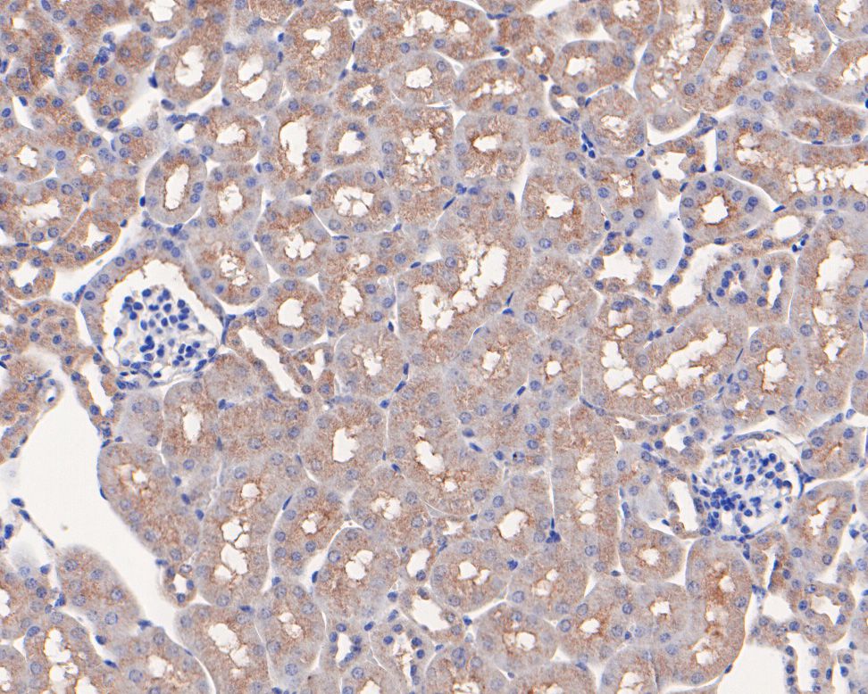 Immunohistochemical analysis of paraffin-embedded mouse kidney tissue using anti-MCL1 antibody. The section was pre-treated using heat mediated antigen retrieval with Tris-EDTA buffer (pH 8.0-8.4) for 20 minutes.The tissues were blocked in 5% BSA for 30 minutes at room temperature, washed with ddH2O and PBS, and then probed with the primary antibody (ET1606-14, 1/50) for 30 minutes at room temperature. The detection was performed using an HRP conjugated compact polymer system. DAB was used as the chromogen. Tissues were counterstained with hematoxylin and mounted with DPX.